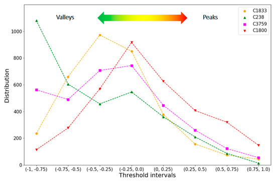 Large differences between these distributions were found in smooth regions. Here, C238 (green curve in Figure 5) had by far the largest number of cells accounting for valleys and C1800 (red) the smallest. Furthermore, C1800 and C238 had the largest and smallest number of cells covering intermediate regions, respectively. In peak regions, the distributions of three of the four datasets were similar, except C1800, which had a larger number of cells accounting for peaks than the others. These findings were consistent with conclusions that could be drawn from visual inspection. Going beyond what could be concluded on the basis of visual inspection, the profiles of C1833 (orange) and C3759 (magenta) were found to be overall similar. While C1833 had more cells accounting for smooth regions than C3759, the traces of the distributions closely followed each other in intermediate and peak regions. Taken together, comparison of cell intensity distributions revealed quantifiable differences between AL images of different datasets and thus provided a sound basis for (dis)similarity analysis.
