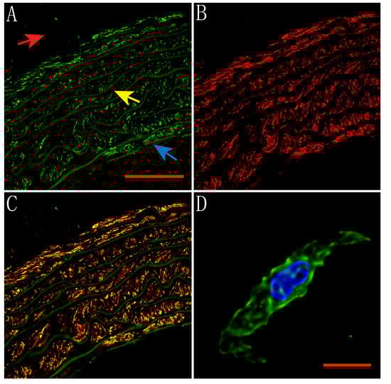 Expression of TRPV1 receptors in the smooth muscle of the rat aorta. (A) TRPV1 receptors labeled with FITC (Green). The scale bar corresponds to 50 μm. (B) Aortic ring labeled with anti-smooth muscle α-actin conjugated with Alexa Fluor 568 (Red). (C) Overlay showing the high co-localization (Yellow) of TRPV1 receptors in smooth muscle. The arrows indicate the arterial layers. The adventitia is marked with red, the tunica media with yellow and the tunica intima with blue. (D) Aortic smooth muscle cell labeled with anti-TRPV1 (Green) and stained with DAPI (Blue). The scale bar corresponds to 10 μm.
