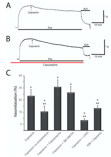 Capsaicin is well known to cause vasorelaxation in several types of blood vessels [5,18,19,20]. Since Capsaicin is a known TRPV1 agonist, its mechanism of action has been postulated to involve activation of these receptors to induce vasodilation. Several studies have recognized the participation of TRPV1 receptors in the regulation of vascular tone [3,10,13,21,22,23,24].