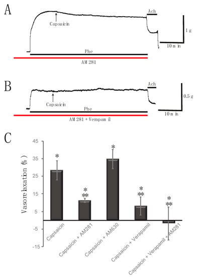 Effect of antagonists on Capsaicin-induced vasorelaxation. (A) Typical record showing that AM281 5 μM partially antagonizes the Capsaicin-induced vasorelaxant effect (11.32 ± 1.24%; p < 0.01; n = 20 rings, 9 rats). (B) Representative trace showing that Verapamil and AM281 together prevent the vasorelaxant effect of Capsaicin causing slight vasoconstriction (1.80 ± 9.38%; p = 0.85; n = 13 rings, 7 rats). The black line shows the exposure to Phe. Black arrows indicate the addition of Capsaicin. Red lines indicate exposure to each of the antagonists. (C) Summary of the action of antagonists on the vasorelaxant effect of Capsaicin. * indicates a significant change in tension compared to Phe pre-contraction. ** highlights a significant change compared to the effect of Capsaicin alone.