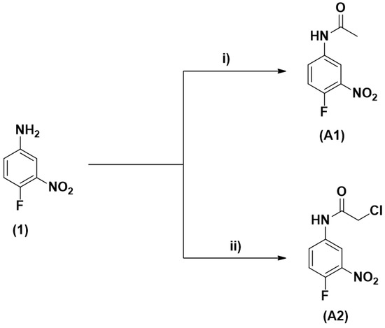 Synthetic route for the synthesis of the target molecules. (A1): N-(4-fluoro-3-nitrophenyl) acetamide, (A2): 2-chloro-N-(4-fluoro-3-nitrophenyl)acetamide. Reagents and conditions: (i) Ac2O, rt, 24 h, 85%; (ii) 2-chloroacetyl chloride, Et3N, DCM, 0 °C to rt, 20 h, 80%.