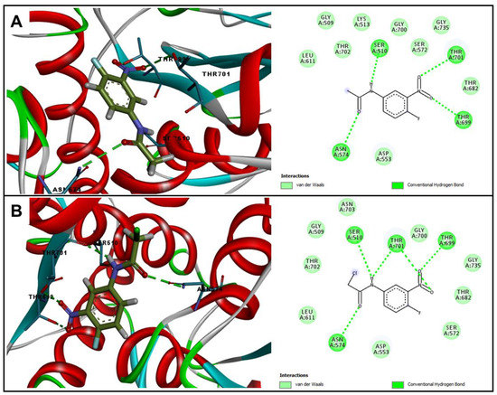 Among all tested enzymes, A2 showed better binding energies for the enzymes penicillin binding proteins (PBPs) 1 and 3, with −59.0 kcal∙mol−1 for both enzymes. In addition to the values of binding energy, another parameter of extreme importance is the interactions carried out with the active site of the enzyme. With PBP1, the A2 and A1 molecules performed hydrogen bonding interactions with the Thr701, Thr 699, Asn574, and Ser510 residues, together with several Van der Walls interactions with other residues from the active site, as can be seen in Figure 2. However, the presence of chloro in A2 is fundamental to better stabilize this molecule in the active site of the enzyme, due to Van der Walls interactions with the Ser510 and Thr702 residues that are important for a good anchorage in this active site [19]. These differences in anchoring reflect the potency of the antibacterial activity that was observed previously, confirming that the A2 molecule has a more pronounced antibacterial effect.