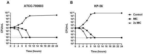 The determination of the action time of A2 substance against K. pneumoniae (ATCC-700603 and KP-56) was carried out exposing the microorganisms to concentrations equivalent to MIC and 2× MIC during times 0, 2, 4, 6, 8, 10, and 24 h. After incubation on Mueller–Hinton agar, bacterial colonies were counted. Bactericidal activity was defined as a ≥3-log reduction in bacterial counts (log10 CFU/mL) [45].