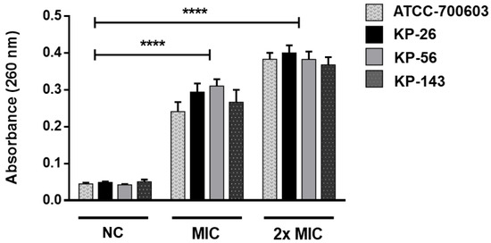 The cell integrity can be assessed by releasing intracellular material, mainly nucleotides, which absorb 260 nm wavelengths. The K pneumoniae strains ATCC-700603, KP-26, KP-56, and KP-143 were used to perform this test. First, the bacterial inoculum was incubated in BHI broth (1 × 107 CFU/mL) overnight at 35 ± 2 °C. Then, centrifugation was performed at 400× g for 10 min. The cell pellet was washed three times with sterile PBS (phosphate-buffered saline) and resuspended in PBS containing the A2 substance at MIC and 2× MIC concentrations. As a negative control, suspensions that underwent the same procedures, but without treatment with the substance, were used. The tubes corresponding to the MIC were incubated for 10 h at 35 ± 2 °C, and the tubes corresponding to the 2× MIC, for 6 h. After incubation, the suspensions were centrifuged at 400× g for 10 min and the supernatants were read on a spectrophotometer at 260 nm [46]. All analyses were performed in triplicate.