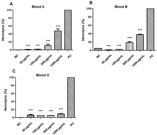 The toxicity of bioactive substances must be assessed to ensure less toxic effect on the system to which it is intended for therapeutic application. In this context, tests with in vitro cytotoxicity screenings are a good alternative to assess the toxic potential of substances. In a study by Rangel et al. [26], red blood cells were used to determine the toxicity of promising drugs. Its effect was classified by percentage considering: low (0% and 40%), moderate (40% and 80%), and high above (80%).
