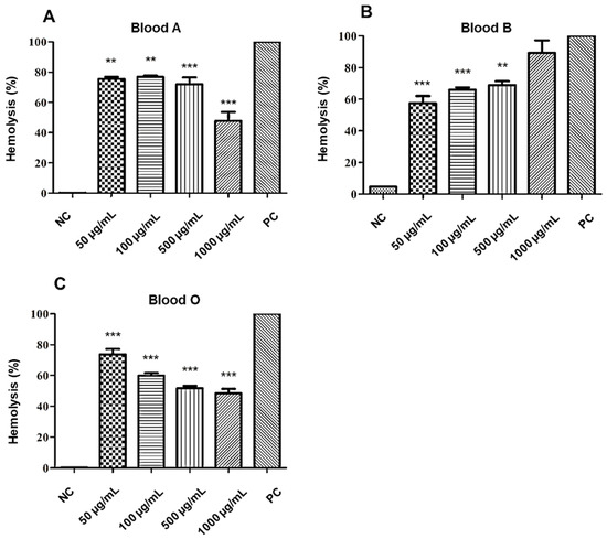 The analysis of the hemolytic potential of the A2 molecule showed a low hemolysis, being approximately 4–20% at 50–500 µg/mL concentrations, in all tested blood types. The highest concentration of the tested molecule (1000 µg/mL) against the erythrocytes of the ABO system demonstrated a percentage of lysis that varied according to blood type. On types A and B, moderate hemolysis was obtained, ranging from 37–47%. However, for type O, a low percentage of hemolysis was observed, with an average of 8% of erythrocyte lysis, as can be seen in Figure 5.