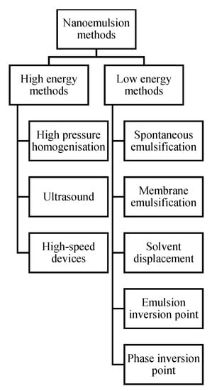 Preparation of nanoemulsion is generally performed by using two different approaches, respectively based on high-energy or low energy needs (Figure 1). High-energy methods imply the application of special equipment, such as sonication devices and high-pressure homogenizers to generate powerful disruptive force to form small oil droplets by causing the breakup of oil and water phases [11,12,13]. The main factors that influence the size of droplets and the properties of nanoemulsions are the amount of energy applied and the choice of surfactants and other additives [14]. There are three main high energy methods classified according to the equipment used: