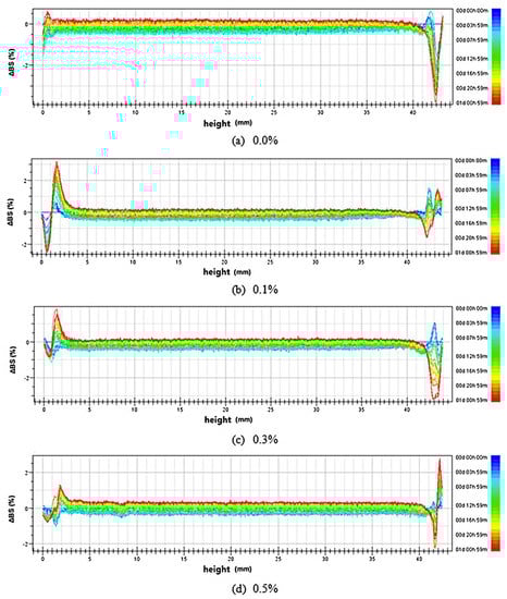 where T0 is transmission value at time zero and ri is the internal radius of the cylindrical vials in which the sample is loaded for the measurement. The technique was applied to monitor the physical stability over time of oil-in-water nanoemulsions stabilized by OSA starch for the encapsulation of lycopene [47]. The back scattering signals are reported in Figure 3. They were almost constant at the 3–41 mm sample height within 24 h, regardless of the lycopene concentration. However, in the bottom (0–3 mm) and the top (41–43 mm) layers, the values changed with time showing significant changes after 24 h (red lines). This indicated a physical instability of the nanoemulsions due to an increase in the droplet diameter induced by coalescence or Ostwald ripening phenomena.