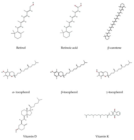 Vitamin A plays an important role in ocular function, bone development and participates in strengthening the immune system [65]. Vitamin D is essential for bone metabolism and has demonstrated anti-inflammatory and immune-modulating properties [66]. Vitamin E and carotenoids belong to the most active biological antioxidants. Vitamin K, instead, is involved in calcium metabolism, bone formation and has a positive effect on cardiovascular system [67].