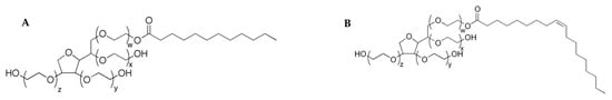 Nanoemulsions are thermodynamically unstable systems, so that addition of chemical substances, known as surfactants or emulsifiers, is needed prior to emulsification process to form nanoemulsions that are kinetically stable for a sufficient amount of time [6,35]. Emulsifiers are surface active molecules that adsorb the oil-water interface of nanoemulsion droplets and reduce the interfacial tension, which in turn decreases the droplet size in the resulting nanoemulsion [1]. The surfactant molecules are oriented so that their non-polar parts protrude into the oil phase while the polar parts protrude into water [36]. Depending on the processing conditions and emulsion composition, different types of food grade emulsifiers can be used in the nanoemulsion composition. Some examples of food emulsifiers are shown in Figure 2. Emulsifiers define the interfacial properties of nanoemulsions: thickness, electric charge, hydrophobicity and chemical reactivity. Consequently, in order to prepare nanoemulsions for specific food applications, it is essential to choose the suitable emulsifier. Food grade emulsifiers include low-molecular-weight surfactants (natural and synthetic) and high-molecular-weight emulsifiers (mainly proteins and polysaccharides). Nowadays, there is an increasing interest to apply as surfactants saponins extracted from natural materials as surfactants [37]. Table 1 summarizes the main surfactants used for nanoemulsion preparation. In many studies for encapsulation of lipid-soluble bioactives in nanoemulsions a combination of oil-soluble and water-soluble emulsifiers is used to create stable nanoemulsions [38,39,40].