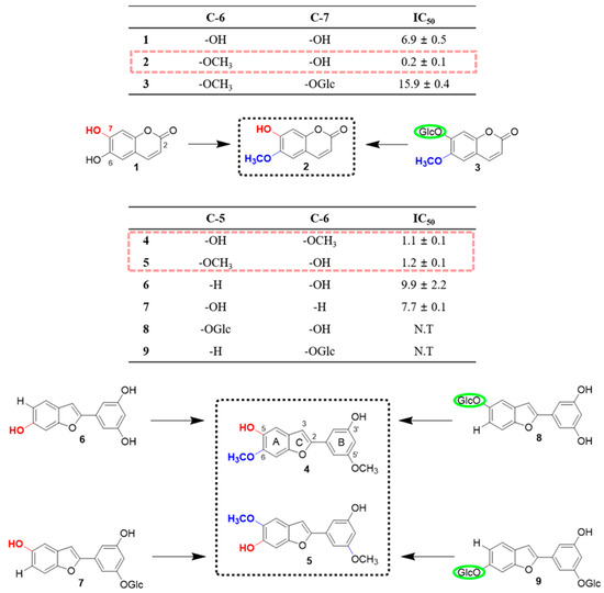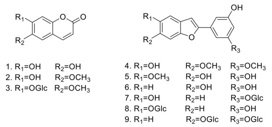 In the present study, nine compounds were isolated from the MeOH extract of M. alba (Figure 1). The structures of the compounds were determined by various spectroscopic methods, including 1D and 2D nuclear magnetic resonance to give aesculetin (1) [12], scopoletin (2) [13], scopoline (3) [14], moracin B (4) [15], moracin J (5) [16], moracin M (6) [17], moracin M 3’-O-β-glucopyranoside (7) [18], moracin M 6-β-D-glucopyranoside (8) [19], and mulberroside F (9) [20] (See Supplementary Materials).