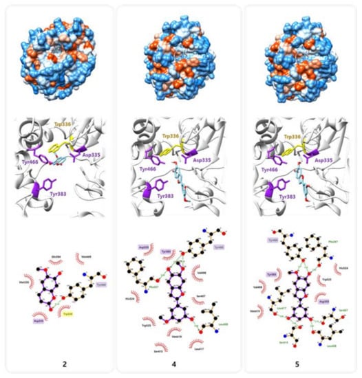 Previous studies have reported a crystal structure showing the interaction between sEH and its potent inhibitor 3-phenylglutaric acid (Protein Data Bank (PDB) code: 3ANS) [24,25]. Based on this information, we investigated, the binding interactions of compound 2, 4, and 5, which were effective on the sEH inhibition, with amino acid residues in sEH by protein–ligand docking simulation using AutoDock Vina and LigPlot+ software (Figure 4). Molecular docking simulation indicated that sEH may interact with compound 2, 4, and 5 by forming several hydrogen bonds and hydrophobic interactions (Figure 4 and Table 2). The pharmacophore analysis suggested that compound 2 created a hydrophobic interaction and a hydrogen bond with the two amino acids Asp335 and Trp466 [7], respectively, among the sEH catalytic triads (Asp335, Tyr383, and Trp466), and a strong π-π interaction with Trp336, such like 3-phenylglutaric acid [24,25]. While compound 4 and 5 seem to block the catalytic pocket of sEH by the interaction of A ring with all catalytic triads and C ring with Ser407, Leu408, Ser415, Leu417, and Met419, locating on the opposite side of Trp336. These binding sites suggest that these amino acid sequences are crucial receptors in the inhibition of sEH enzyme activity. The interaction with catalytic triads were known to conservatively contribute to stabilizing the binding between sEH and its various inhibitors [24].