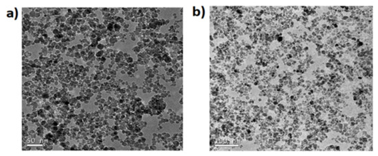 The syntheses of Fe3O4@SiO2-NH2 and Fe3O4@SiO2-NH2-COOH were done using co-precipitation method, followed by Stober process and functionalization [50,51], though the critical point in the synthesis procedure is to use the mechanical stirrer and not the magnetic bead stirring procedure as is commonly used in other colloidal synthesis routes. This is necessary to avoid the MNPs from sticking to the bead, hence the mechanical stirring is necessary to disperse the MNPs in the solution for the reaction to take place. This is used only in the silica coating procedure; after that, magnetic stirring can be used in these MNPs as, after the silica coating, the direct contact to the magnetite core is prevented by the silica shell. After the synthesis of the magnetite core, it is important to first disperse the MNPs using an ultrasonicator before any further reactions. There is a slight increase in the size of the MNPs after silica coating, which is further increased by functionalizing with the NH2 and COOH groups. The Fe3O4@SiO2 MNPs are shown in TEM images (see Figure 1a) with the characteristic spherical shape of these MNPs with a mean size of 9.3 ± 1.6 nm (see Figure 1b). When the Fe3O4@SiO2 MNPs are coated with amine and a carboxylic acid, the spherical shape is maintained as Figure 2 shows but the average size increases to 10.7 + 2.1 nm and 11.6 ± 1.7 nm (see Figure 3).