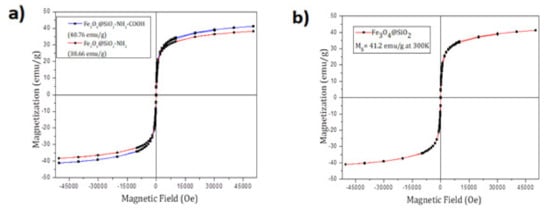The hysteresis curve of Fe3O4@SiO2-NH2 MNPs: 38.66 emu/g, Fe3O4@SiO2-NH2-COOH: 40.76 emu/g (a) and Fe3O4@SiO2: 41.2 emu/g (b).