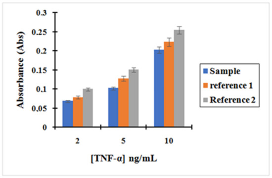Bar graph showing (blue) the measurement of the absorbance after TNF-α incubation with the complex MNP@SiO2-NH2-CO-anti-TNF-α at three different concentrations of TNF-α: 2, 5, and 10 ng/L; (Orange) reference 1 represent the measurement of the absorbance of TNF-α after incubation with non-activated MNPs; (grey) Reference 2 represent the measurement of the absorbance of TNF-α after incubation with the initial MNPs.