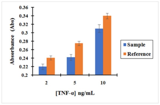 Bar graph showing (blue) the measurement of the absorbance after TNF-α incubation with the complex MNP@SiO2-NH2-CO-anti-TNF-α at three different concentrations of TNF-α: 2, 5, and 10 ng/L; (Orange) the measurement of the absorbance of TNF-α after incubation with no activated MNPs. Background fixed in artificial saliva at 1/500. Error bars correspond to three replicates per sample.