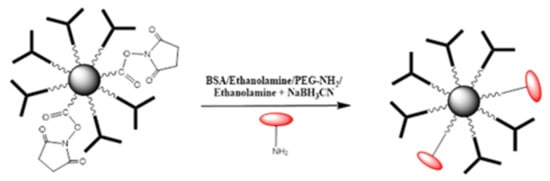 The deactivation protocol was the same as described above. The MNPs were activated using a mixture of EDC/NHS. Then, anti-TNF-α antibody was added to the activate MNPs. Afterwards, the deactivating solution was changed consecutively as aforementioned. As an illustration, the deactivation of remaining R-CO-NHS groups using BSA/Ethanolamine/PEG-NH2/Ethanolamine + NaBH3CN is presented in Figure 9.