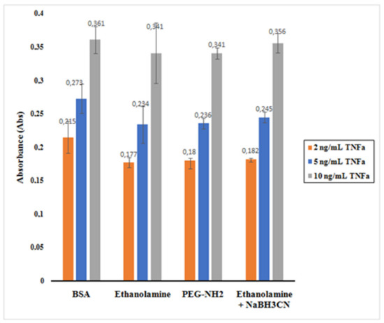 It is observed that BSA appeared to be the best among the mixtures assessed. When 0.1% of BSA in PBS was used as deactivating mixture, TNF-α was less physisorbed to the nano-collector leading to a higher absorbance as the total amount of unreacted TNF-α remained relatively high. The ethanolamine + NaBH3CN mixture also indicated similar behavior. However, in the case of ethanolamine and PEG-NH2, the absorbance reading was lower as a result of a decreased concentration of unreacted TNF-α.