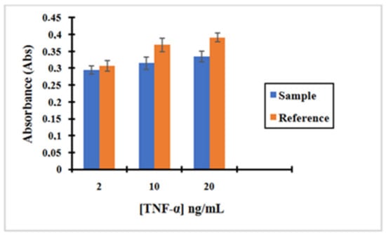 As shown in Figure 7, the absorbance decreased following the trend Reference 2 > Reference 1 > Sample. This is consistent with the results expected in Reference 2. The decrease in the amount of TNF-α in the supernatants when compared with its initial concentration can only be attributed to physisorption on the MNPs surfaces. However, in Reference 1, TNF-α can interact with anti-TNF-α antibodies that have been adsorbed to the surface of the MNPs. This effect is shown by a decrease in the absorbance read when compared to Reference 2. Finally, in “Sample”, the complex MNP@SiO2-NH2-CO-anti-TNF-α binds the antigen TNF-α more effectively as antibodies are both covalently bonded and physisorbed to the MNPs. Therefore, the pre-concentration effect when incubating TNF-α with “Sample” is much more important.