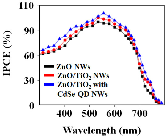 Normalized incident photon conversion efficiency (IPCE) spectra of the PSCs based on ZnO NWs without and with AgCl-doped CdSe quantum dots modification.