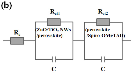 The spectra in Figure 4a were obtained in the frequency range from 5 to 100 kHZ with an AC amplitude of 5–10 mV under a constant light exposure of 100 mW/cm2 to analyze the carrier transport at the surface of the NW/perovskite layers with AgCl-doped CdSe QDs. The equivalent circuit and determined parameters are detailed in Figure 4b (Figure S3). The influence of the core/shell arrays with the AgCl-doped CdSe QD heterostructure on the recombination parameter (Rct1) at ZnO/TiO2 NW arrays with AgCl-doped CdSe QD surface equivalent toward low frequency domain at Nyquist plots is shown [26,27]. Rct1 of the ZnO/TiO2 NW-based perovskite solar cell (625.8 Ω) was less than those of cells based on interfacial ZnO/TiO2 core/shell arrays with AgCl-doped CdSe QDs (846.7 Ω), indicating that the QD heterostructure decreased the recombination yield between ZnO/TiO2 and CH3NH3PbI3. The modification with AgCl-doped CdSe QDs increased the open-circuit voltage and fill factor, thereby improving Rct1.