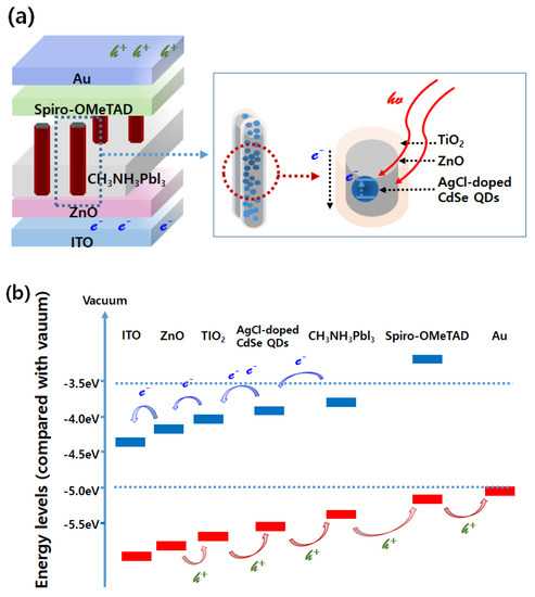 Perovskite photovoltaics based on the combination of organo–lead halide photon energies have gained intensive interest owing to their excellent photoelectric efficiencies and potential for use in flexible devices. For example, the perovskite CH3NH3PbI3 has the merits of high mobility and carrier diffusion and a long lifetime [1,2,3,4,5,6,7,8]. To improve the device stability and performance of perovskite photovoltaics, studies have proposed several strategies such as a CdSe quantum dot (QD)/PCBM hybrid for improved carrier diffusion [9,10], changing the iodide ion concentration [11], introducing a SnO2 protective structure between perovskite layers and ZnO nanowires (NWs) with TiO2 modification for carrier recombination [12,13,14]. However, previous research has shown that a decrease in the carrier recombination of TiO2 occurs owing to the mismatched electron recombination of perovskite photovoltaics [15,16]. With its wide direct band gap (Eg = 3.37 eV at room temperature) [17,18], ZnO exhibits a different structure in photovoltaics [19,20,21] and is considered a promising alternative to the present TiO2 arrays with AgCl-doped CdSe QDs, characterized by rapid carrier recombination [22,23]. Furthermore, ZnO/TiO2 with AgCl-doped CdSe QDs as an electron transport layer (ETL) has the advantage of improving the photon absorption and thus presenting a significant path for carrier recombination. Although the photoelectric conversion efficiency of ZnO-based devices is significantly lower than that of TiO2-based cells, the carrier transport leads to a low charge recombination of ZnO and the stability of perovskite/zinc heterostructures [24,25].