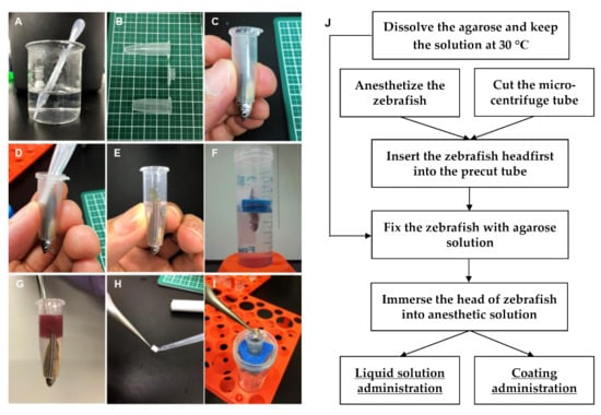 Procedure for transdermal administration in adult zebrafish. (A) Dissolved 3% agarose solution; (B) A 1.5 mL micro-centrifuge tube with the tip cut off up until approximately 10 mm; (C) anesthetized zebrafish inserted into the precut micro-centrifuge tube; (D) zebrafish fixed with agarose solution; (E) zebrafish fixed with hardening agarose; (F) fixed zebrafish immersed into anesthetic solution; (G) liquid solution applied into the fixing tube; (H) filter paper cut to approximately 2.5 × 5-mm pieces, and the test chemical (coating) applied; (I) filter paper affixed to the tail fin using forceps; (J) schematic of the transdermal administration procedure.