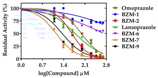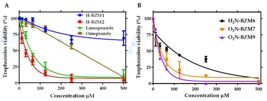 - Pérez-Villanueva, J.; Romo-Mancillas, A.; Hernández-Campos, A.; Yépez-Mulia, L.; Hernández-Luis, F.; Castillo, R. Antiprotozoal activity of proton-pump inhibitors. Bioorganic Med. Chem. Lett. 2011, 21, 7351–7354. [Google Scholar] [CrossRef] [PubMed]
