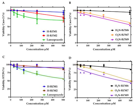2.3. Cytotoxic Effect of Compounds on Human Intestinal Caco-2 and HT29 Cells
