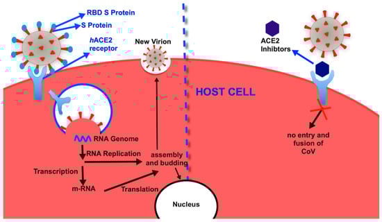 - Han, D.P.; Penn-Nicholson, A.; Cho, M.W. Identification of critical determinants on ACE2 for SARS-CoV entry and development of a potent entry inhibitor. Virology 2006, 350, 15–25. [Google Scholar] [CrossRef]
