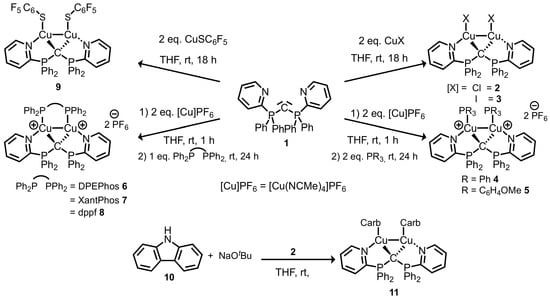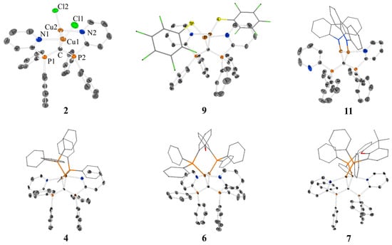 Single crystals suitable for X-ray diffraction analysis were obtained upon layering THF or DCM solutions of the complexes with n-pentane. Crystal structures for 2, 4, 6, 7, 9, and 11 are shown in Figure 1, selected bond distances and angles are shown in Table 1. Further details of the XRD analyses of 3, 5, and 8 are described in the Supplementary Materials. The molecular structures of 2–9 reveal that the central carbon atom within the CDP ligand is capable of coordinating two copper atoms in a geminal fashion. Each copper atom is additionally coordinated by one 2-pyridyl unit of ligand 1. If the Cu–Cu interaction is disregarded, the two copper atoms per molecule are coordinated in a planar fashion, which is more T-shaped than trigonal planar. Each copper atom is interacting with one of the two carbone lone pairs of the central carbon atom C1, each by one nitrogen atom of a 2-pyridyl chelate ring and by the variable neutral ligand L or anionic ligand X. The strongest ligand interactions (C and X/phosphine) define a Cu(I) archetypical close to the linear axis. The geminal nature of both copper(I) centers leads Cu–Cu distances in the range of 2.55–2.67 Å (Table 1). These distances are smaller than twice the size of the covalent radius of Cu (1.32 Å) [71] or twice the size of the van der Waals radius of Cu (1.4 Å) [72]. Twice the size of the Cu(I) covalent radius (1.27 Å) [73] is close to the observed Cu–Cu distance. Similar trends are observed in dinuclear Cu(I) CDP complexes without any constraints of additional chelating CDP functions [74]. The Cu–Cu interaction leads to a formally coordinatively saturated pseudo tetrahedral coordination around each copper atom. This dinuclear entity is intramolecularly stabilized by a neutral 4-electron donor carbone ligand bridging the two Cu atoms. This rather rigid ligand template is characterized by characteristic torsion angles X–Cu–Cu–X in the range 41.9° (2)–76.0° (3) for anionic ligands X (X = Cl, I, S(C6F6) or L–Cu–Cu–L in the range 62.4° (8)–82.9° (4) for phosphine and the bridging bisphosphine ligands. The rather rigid frame of this N,C,N-ligand backbone seems to be privileged to stabilize this 8-electron-5-center inner Cu2CN2 core.