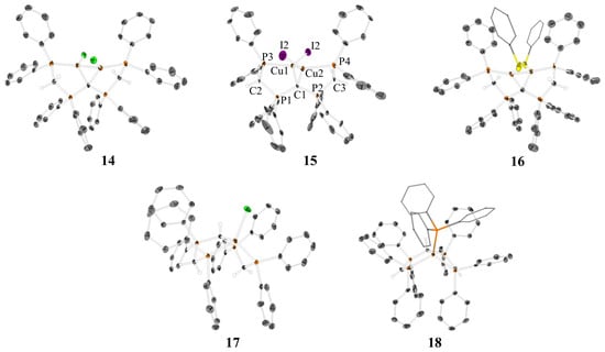 XRD molecular structures of [(CuCl)2(CDP(CH2PPh2)2] (14), [(CuI)2(CDP(CH2PPh2)2] (15), [(CuSPh)2(CDP(CH2PPh2)2] (16), [CuCl(H-CDP(CH2PPh2)2]PF6 (17), and [CuPPh3(CH(PPh2CHPPh2)2] (18). Hydrogen atoms and solvent molecules have been omitted for clarity; thermal ellipsoids are given at 50% probability. For 17, the counter anion [PF6]− is omitted for clarity. The labeling of 15 is identical for all species. For more details, see the Supplementary Materials.