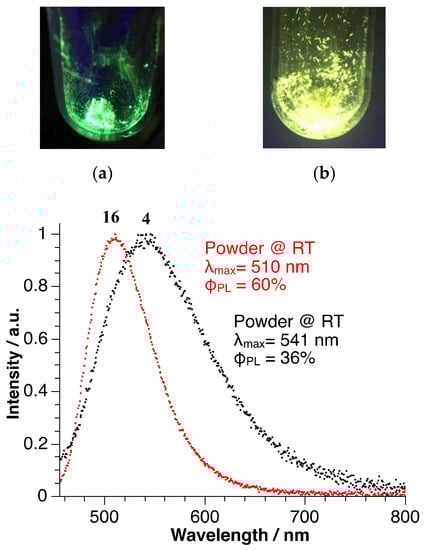 Since the photophysical properties of carbodiphosphorane Cu(I) complexes have not yet been considered, the first investigations were performed in this report. The Cu(I) complexes 2–7, 9 and 14–16 show photoluminescence upon irradiation with UV light at room temperature. As proof of concept, we investigated emission spectra and quantum yields of [(CuPPh3)2(CDP(Py)2)](PF6)2 (4) and [(CuSPh)2(CDP(CH2PPh2)2] (16). Figure 3 illustrates the normalized room-temperature emission spectra of these materials. Compound 4 shows an emission maximum at 541 nm, corresponding to green/yellow color, along with a quantum yield (ΦPL) of 36% for the powder sample. The emission maximum of [(CuSPh)2(CDP(CH2PPh2)2] (16) (powder) is found at 510 nm (green color) showing ΦPL = 60%. The high quantum yields indicate the relatively high rigidity of the complexes in powder form. Moreover, these materials are chemically robust: After exposing the complexes to air for two months, the compounds still show their characteristic photoluminescence upon irradiation with UV light at room temperature.
