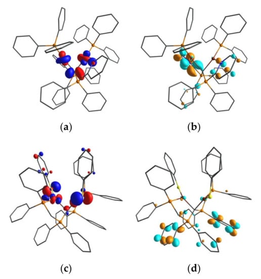Kohn–Sham orbitals of HOMO (a), LUMO (b) of [(CuPPh3)2(CDP(Py)2)](PF6)2 (4) and HOMO (c), LUMO (d) of [(CuSPh)2(CDP(CH2PPh2)2] (16) calculated for the optimized S0 state geometry (isovalue = 0.05). Calculations were performed at the PBE-D3(BJ)/def2-TZVPP level of theory. For more details of the MOs, compare Figure S-43 and Figure S-44 in the Supplementary Materials.