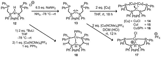 Peringer et al. developed P,C,P–CDP pincer complexes of a formal carbone ligand C(dppm)2, which was not isolated and characterized, but trapped in the form of its complexes [18,19,20,21,22,23,24]. The synthetic strategy involved complex redox reactions. It is limited to the characterization of Ni(II), Pd(II), Pt(II), or Au(III) complexes so far. Our synthetic approach was to isolate the free CDP base. Thus, [CH(dppm)2]Cl (12) [18,19] was treated with an excess of sodium amide (6.5 eq.) in liquid ammonia at −78 °C. Since the basicity of sodium amide leads to the deprotonation of only one proton, CDP(CH2PPh2)2 (13) could be isolated in 98% yield as an intense yellow powder. No further deprotonation products and no adduct formation with lithium salts were observed as in the case of using organolithium bases. The isolation of 13 was the precondition to access the coordination chemistry of Cu(I) with this P,C,P–CDP ligand base. Dinuclear copper complexes 14–16 were synthesized and characterized via NMR spectroscopy and mass spectrometry (Scheme 2).