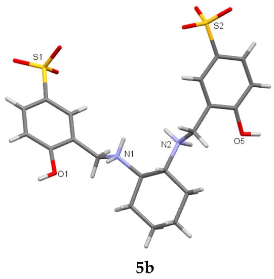 Scarcely any similar compounds have been reported that could be compared to our new structures. However, in such cases, a great degree of similarity is found. For example, the major difference in the bond distances of 1 × 2H2O (Figure 1) and its already known solvomorph [44], 1 × DMSO, is in the C8–C8(i) bond length (1.529(11) Å vs. 1.495 Å). The starting compound for the synthesis of PrHSS (2), i.e., N,N’-bis(2-hydroxybenzyl)-1,3-diaminopropane, PrHS, was previously crystallized with various aromatic polycarboxylates [48] and SC-XRD studies revealed the protonation of the secondary amine groups of PrHS, similar to the case of PrHSS (2) (Figure 2). Comparison of the structure of n-K4[μ8-BuHSS][μ2-H2O]4[H2O]6 published by us earlier [46] to the one of 3 in this study (Figure 3), shows, that the N1–C7–C1 angles are almost the same (114.28° and 114.4°) in the two molecules, and only the positions of the aromatic groups are different (Figure S15). Superposition of the structures of the salan ligand, meso (RS,SR)-N,N’-bis(2-hydroxybenzyl)-1,2-diphenyl-1,2-diaminoethane [49] and its sulfonated product, dPhHSS (4) (Figure 4) also shows high degree of similarity (Figure S20) and proves that the starting salen underwent hydrogenation as well as sulfonation in the p-position relative to the phenolic oxygen. The major difference between the structures of 5b (Figure 5) and its starting material for synthesis, i.e., (±)-trans-CyS [50] is in the position of the aromatic rings (Figure S23). Perhaps the most important information is that, during the synthesis of cis-CyHSS × 2H2O (5ca) (Figure 5), the cis-conformation in the Schiff base formed in the reaction of salicylaldehyde and cis-1,2-diaminocyclohexane is retained throughout hydrogenation and sulfonation. An interesting observation is that, when a racemic mixture of cis-CyHSS and trans-CyHSS was subjected to crystallization from water, the procedure yielded only crystals of cis-CyHSS (5cb) (Figure 5). The cyclohexyl ring of the sulfonated product cis-CyHSS overlaps precisely with the cyclohexyl ring in N,N’-di-5-nitrosalicylidene-(R,S)-l,2-cyclohexanediamine, published by Desiraju et al. [51] (see superposition of the molecules, Figure S27).