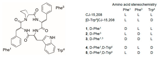 The stereoisomers of CJ-15,208 and its d-Trp isomer (Figure 1) were synthesized by a combination of solid phase synthesis of the linear precursors followed by cyclization in solution using modifications to our original strategy [20,22] to improve the yields of the macrocyclic peptides.