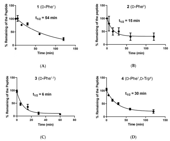 Following centrifugation at 10,000× g rpm for 10 min, the supernatant (50 µL) was diluted with water (75 µL), stored overnight at −20 °C and analyzed by LC-MS/MS using methodology similar to that described for [d-Trp]CJ-15,208 [32]. Liquid chromatography was performed on a Hypersil BDS C8 column (50 mm × 2.1 mm, 3 µm) with a flow rate of 0.2 mL/min and an injection volume of 20 µL using an Acquity UPLC system (Waters, Milford, MA, USA). The peptides were separated using a gradient of aqueous acetonitrile containing 0.08% formic acid of 20% B (0–2 min), 20–50% B (2–3 min), 50–80% B (3–6 min), 80% B (6–7 min), 80–20% B (7–8 min) and 20% B (8–10 min).