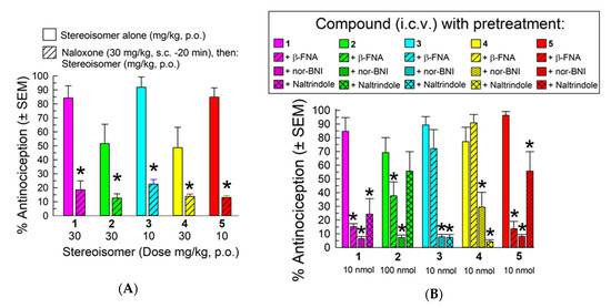 Evaluation of opioid receptor involvement in the antinociceptive activity of the stereoisomers in the 55 °C warm-water tail-withdrawal assay 20 min after (A) p.o. administration in mice pretreated with the non-selective opioid receptor antagonist naloxone (30 mg/kg., s.c., −20 min), or (B) 20 min after i.c.v. administration in mice pretreated with the selective MOR antagonist β-FNA (10 mg/kg, i.p., −24 h), the selective KOR antagonist nor-BNI (10 mg/kg, i.p., −24 h), or the selective DOR antagonist naltrindole (20 mg/kg, i.p., −20 min). Points represent average % antinociception ± SEM from 8–16 mice for each bar. * significantly different from response of stereoisomer alone (p < 0.05. ** two significant bars adjacent to each other.; two-way ANOVA with (A) Sidak’s or (B) Tukey’s multiple comparisons post hoc test).