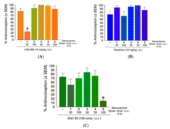 Opioid antagonist activity of the stereoisomers in the 55 °C warm-water tail-withdrawal assay. Mice were pretreated with a stereoisomer (30 or 100 nmol., i.c.v.) 3 h prior to the administration of (A) the KOR selective agonist U50,488 (10 mg/kg., i.p.), (B) the MOR preferring agonist morphine (10 mg/kg., i.p.), or (C) the DOR selective agonist SNC-30 (100 nmol, i.c.v.) to assess their ability to significantly reduce the antinociceptive effect of the opioid agonist. Mean % antinociception ± SEM from 8 mice for each bar. * significantly different from response of agonist alone (p < 0.05); one-way ANOVA with Sidak’s multiple comparison post hoc test.
