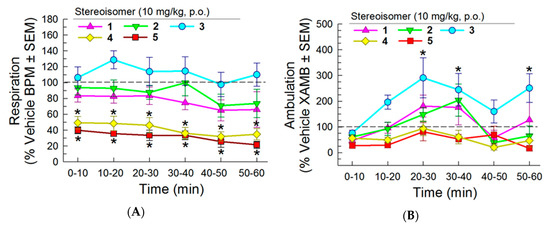 Effects of the stereoisomers on (A) respiration and (B) ambulation in C57BL/6J mice tested in the CLAMS/Oxymax system. Respiration and ambulation were monitored after administration of stereoisomer (10 mg/kg, p.o.) or vehicle using the CLAMS/Oxymax system. Data from 8–16 mice presented as % vehicle response ± SEM; breaths per minute, BPM (A) or ambulation, XAMB (B). * significantly different from vehicle control response (p < 0.05); two-way RM ANOVA with Dunnett’s multiple comparison post hoc test.