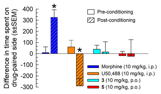 Analogs 3 and 5 were further evaluated in a conditioned place-preference assay (Figure 8). Following a two-day place conditioning paradigm, mice conditioned with morphine (10 mg/kg, i.p.) demonstrated a significant place-preference for the morphine-paired chamber, whereas mice conditioned with U50,488 (10 mg/kg, i.p.) demonstrated a significant conditioned place avoidance (F(3,53) = 5.38, p < 0.05; two-way ANOVA with Sidak’s multiple comparison post hoc test; Figure 8).