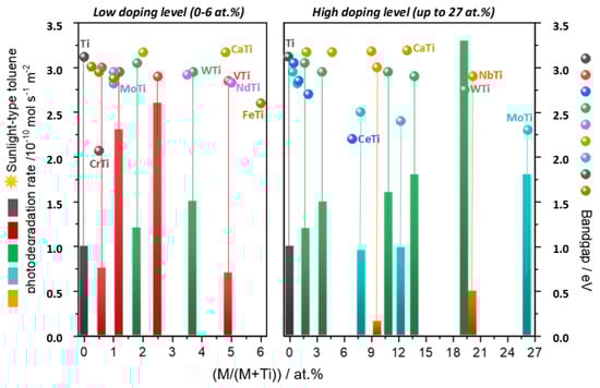 - Christoforidis, K.C.; Figueroa, J.S.A.; Fernández-García, M. Iron-Sulfur codoped TiO2 anatase nano-materials: UV and sunlight activity for toluene degradation. Appl. Catal. B Environ. 2012, 117–118, 310–316. [Google Scholar] [CrossRef]