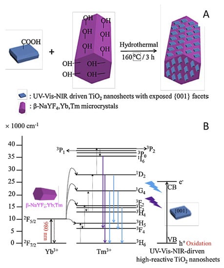 - Wang, W.; Huang, W.; Ni, Y.; Lu, C.; Xu, Z. Different upconversion properties of β-NaYF4:Yb3+, Tm3+/Er3+-TiO2 in affecting the near-infrared-driven photocatalytic activity of high-reactive TiO2. ACS Appl. Mater. Interfaces 2014, 6, 340–348. [Google Scholar] [CrossRef]