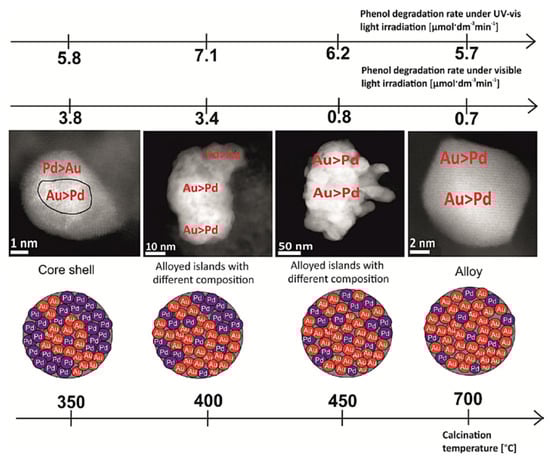 - Cybula, A.; Priebe, J.B.; Pohl, M.-M.; Sobczak, J.W.; Schneider, M.; Zielińska-Jurek, A.; Brückner, A.; Zaleska, A. The effect of calcination temperature on structure and photocatalyticproperties of Au/Pd nanoparticles supported on TiO2. Appl. Catal. B Environ. 2014, 152–153, 202–211. [Google Scholar] [CrossRef]