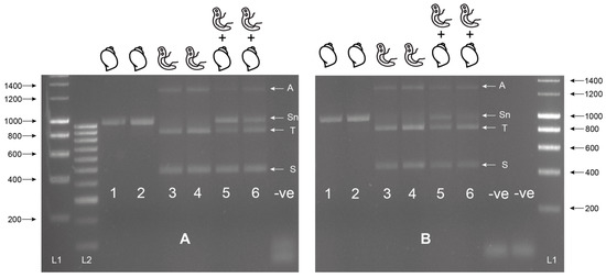 Multiplex ITS xenomonitoring assay trial at 55 °C (A) and 60 °C (B). Includes gDNA of Bulinus wrighti of both BioSprint (Lane 1 and 5) and DNeasy extractions (Lane 2 and 6) and gDNA of Schistosoma haematobium (Lane 3 and 5) and S. bovis (Lane 4 and 6). Combinations of B. wrighti and S. haematobium (Lane 5) or S. bovis (Lane 6) gDNA shown. Sn = snail amplicon, T = trematode amplicon, S = Schistosoma amplicon, and A = non-specific amplicon or artifact. L1 = HyperLadder I. L2 = HyperLadder IV (Bioline, London, UK). -ve = negative, no template control.