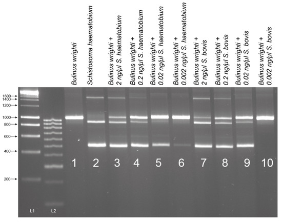 The assay proved highly sensitive with a limit-of-detection (LoD) of 0.02 ng and 0.002 ng of gDNA for S. bovis and S. haematobium, respectively (Figure 4). Sensitivity appeared higher for S. haematobium (Figure 4), but in both the cases, the assay’s sensitivity was above that necessary to detect gDNA from a single miracidium, which ranges from 1.6–3.65 ng/µL [32]. At lower Schistosoma DNA concentrations, the 1005 bp trematode band (T) lost sensitivity compared with the smaller Schistosoma-specific band.