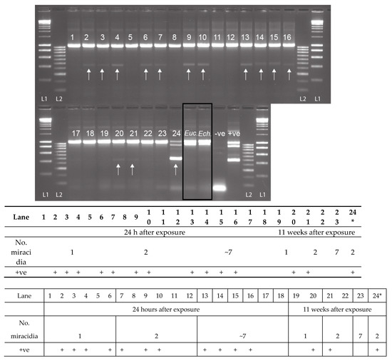 Experimental infections of Bulinus truncatus with Schistosoma haematobium (1–24), field-collected B. globosus infected with Euclinostomum sp. (Euc.) and field-collected B. nasutus shedding Echinostoma sp. cercariae (Ech.). The S. haematobium DNA amplicon was present (+ve) in 13 of the 23 non-patent snails (11 at 24 h post-exposure, and two at 11 weeks post-exposure), highlighted by the arrow. Lane 24 = B. truncatus sample that was shedding S. haematobium cercariae 11 weeks after exposure. The positive control (+ve) is a mix of B. wrighti and S. haematobium control gDNA. L1: HyperLadder I, L2: HyperLadder IV (Bioline, London, UK).