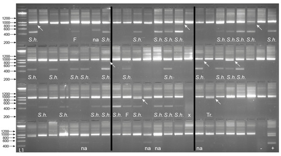 Gel images for the multiplex ITS xenomonitoring (MIX) PCR amplicons for 94 non-patent Bulinus globosus collected from Wambaa, Pemba, United Republic of Tanzania. The text under each amplicon denotes the outcome of the Schistosoma sp. targeted sequencing where relevant (i.e., presence of 538 bp amplicon), which resulted in either S. haematobium (S.h.) or sequencing failure (F). The presence of a trematode band without the presence of the Schistosoma band indicated a non-Schistosoma trematode infection (Tr.). Other non-specific bands, in this case, larger bands (NA), were also observed in these snail populations, which did not amplify with the secondary SIX PCR. x = sample failure with no control amplicon. Arrows highlight the presence of the ~1000 bp trematode band when present (n = 8). B. globosus with a patent S. haematobium infection (Cham10.1 see [6]) was run as a positive control (+ve) and also represented the amplicon profile obtained for the seven patent B. globosus snails (five and two with S. bovis and S. haematobium infections, respectively (see Section 2.4). -ve = the non-template negative control. L1—HyperLadder IV (Bioline, London, UK).