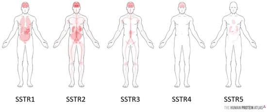 Somatostatin receptors are widely distributed in healthy tissues, with distinct expression throughout the body (Figure 1). It is quite possible to find several subtypes in the same tissue. Each of the SSTRs is involved in the regulation of the various processes: (i) SSTR1 is involved in the antisecretory effects of growth hormone, prolactin (a peptide hormone involved in lactation, reproduction, growth, and immunity) and calcitonin (regulation of calcemia); (ii) SSTR2 also inhibits the secretion of growth hormone and adrenocorticotropin (hormone that stimulates the adrenal glands), glucagon, insulin, interferon-γ (protein produced by immune cells), and stomach acid; (iii) SSTR5 has the same inhibiting effect on growth hormone, adrenocorticotropin, insulin, and inhibits the secretion of amylase (digestive enzyme constituting saliva and pancreatic juice); (iv) SSTR3 reduces cell proliferation and causes cell apoptosis; (v) the functions of SSTR4 are not yet well defined [3].